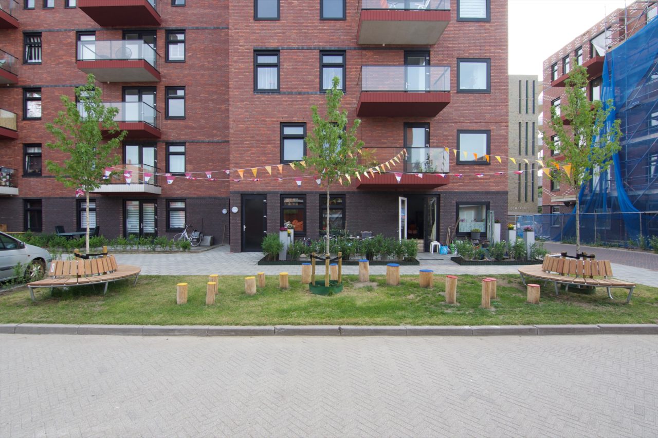 De gemeenschappelijke buitenruimtes van de blokken zijn met elkaar verbonden. Zo ontstaat, gecombineerd met een slimme parkeeroplossing, één grote gezamenlijke ruimte met meer mogelijkheden voor invulling door de bewoners en omwonenden. Groene hagen en fruitbomen zorgen voor heldere overgangen tussen privé, gezamenlijk en openbaar. Met deze organisatie van appartementen en buitenruimte leveren we met hetzelfde budget en binnen de ruimtelijke kaders meer kwaliteit en vierkante meters voor opdrachtgever, de bewoners als omwonenden.