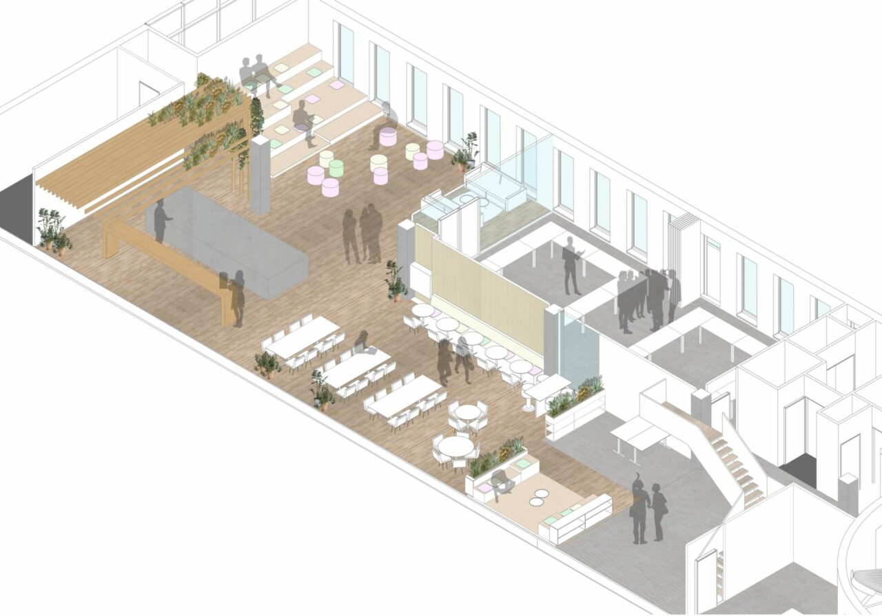De begane grond is ingericht als uitnodigende, openbare ruimte waar iedereen welkom is. Hier bevindt zich een werkcafé voor de medewerkers, waar ook bezoekers iets kunnen eten of drinken. De ruimte nodigt op diverse manieren uit tot verblijven, onder andere met een brede, trapsgewijs verlopende zitvloer. Via een vide is de begane grond verbonden met de eveneens vrij toegankelijke eerste verdieping, waar de muziekuitleen zich bevindt.
