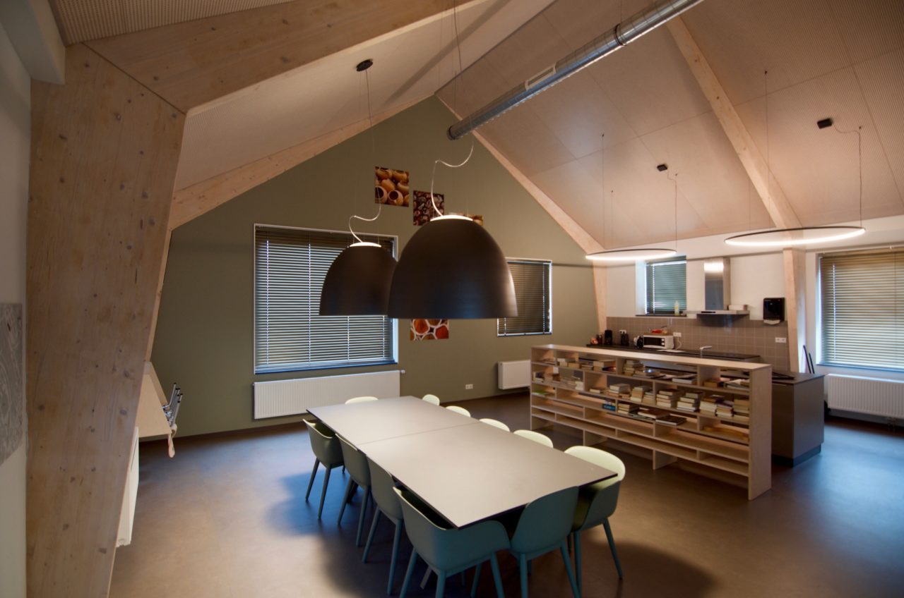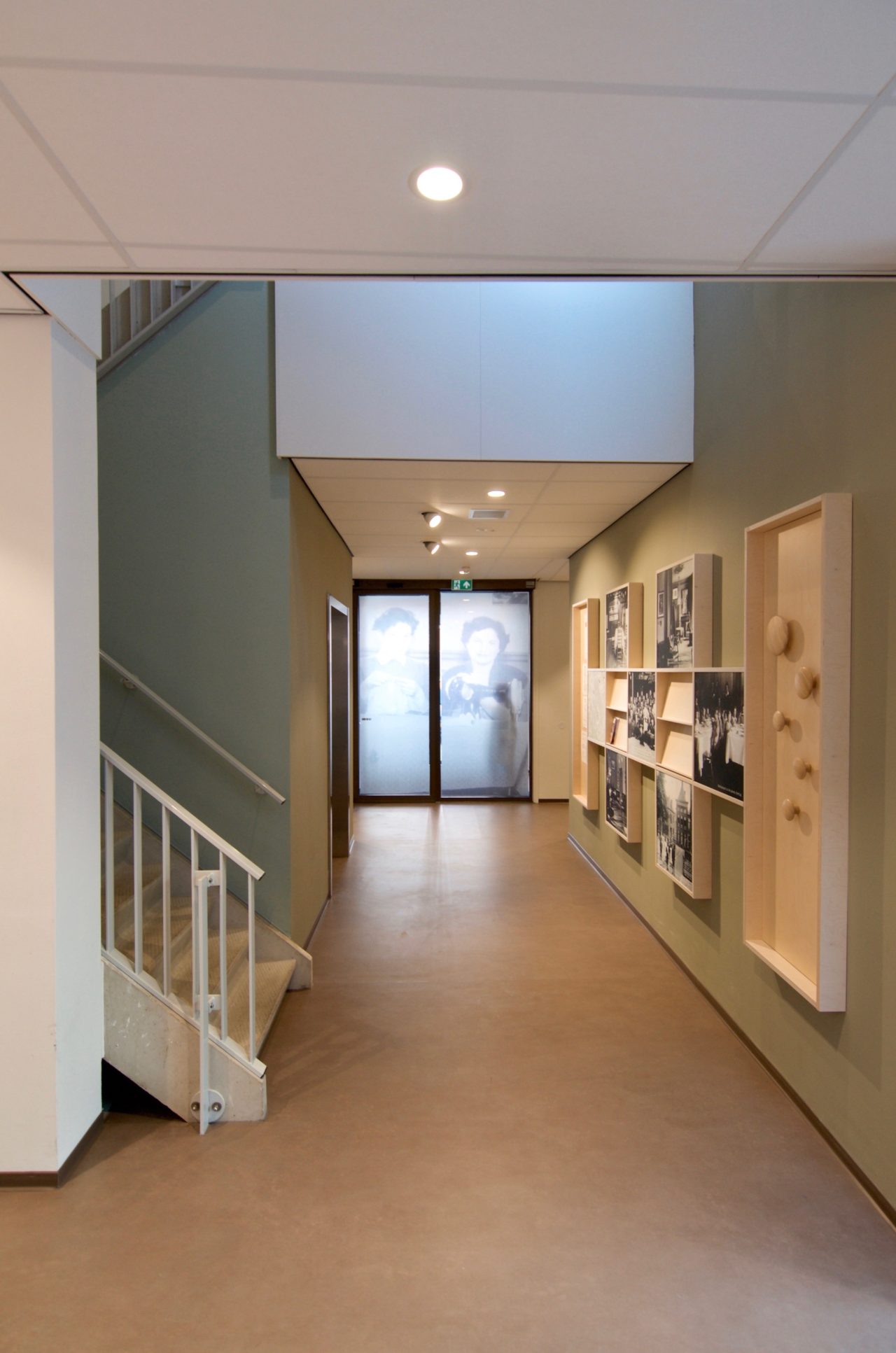 De verschillende functies van het gebouw vroegen om verschillende ontsluitingstypen met ieder een eigen organisatie en beukmaat: vrije plattegrond voor de kantoren en therapieruimtes, kamers met centrale gang voor de vrouwenopvang en galerijontsluiting voor de appartementen.