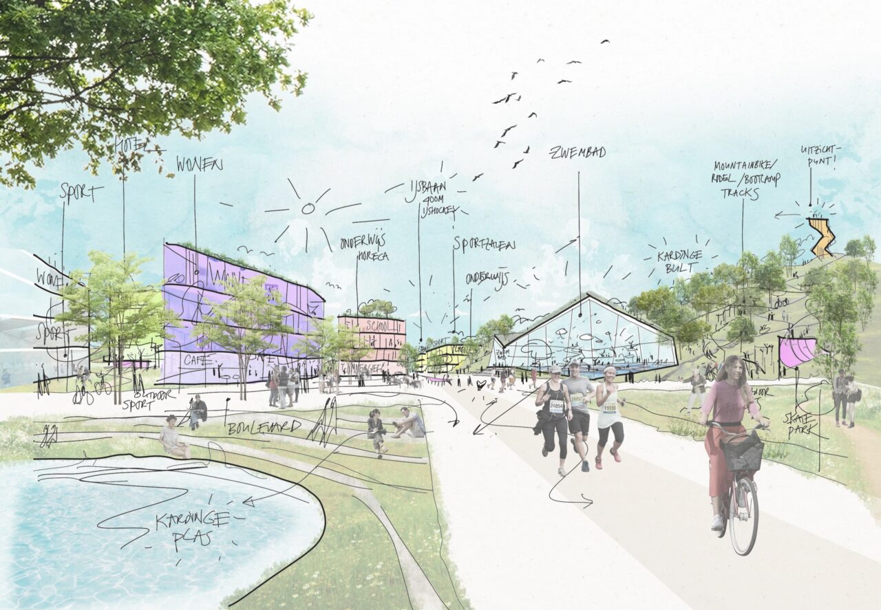 De verschillende sportaccommodaties die zijn ondergebracht in het huidige sportcentrum worden in eigen, representatieve alzijdige paviljoens aan de boulevard gesitueerd. De schaatsbaan en technische functies worden daarachter gedeeltelijk in de vergrote Kardingebult ingegraven. De Kardingebult wordt vergroend, krijgt diverse sportieve functies en wordt van alle kanten toegankelijker gemaakt. De daken van de paviljoens worden eveneens vergroend en sluiten wat betreft hoogte aan op de Kardingebult. Zo ontstaat een groen, begaanbaar daklandschap dat naar alle richtingen een bijzonder gezicht laat zien, en waarin de verschillende sportfuncties elk hun eigen representatieve identiteit hebben.