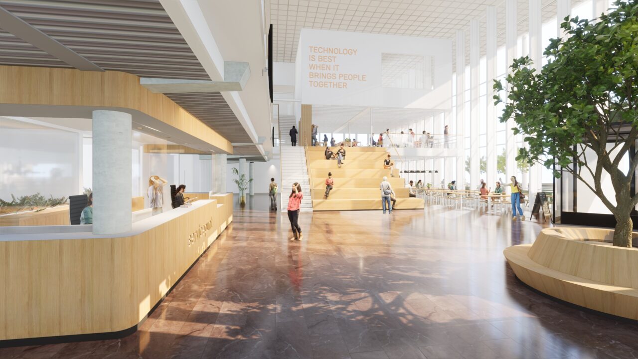 De vernieuwde entreezone biedt in één oogopslag overzicht en verbinding. De vloer van rode natuursteen en de houten inrichting zorgen voor een aantrekkelijke, warme sfeer. Als bezoeker heb je meteen zicht op de levendige onderwijsruimtes, die direct zijn verbonden met de entreezone. De entree gaat naadloos over in het restaurant op de begane grond. De houten balie en de brede houten zittrap die naar het onderwijs en het restaurant op de verdieping leidt, zijn uitnodigende spelverdelers en blikvangers.
