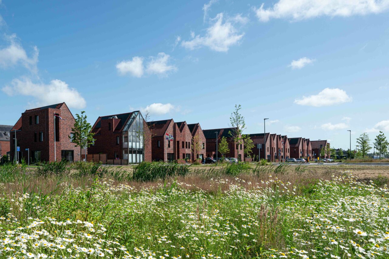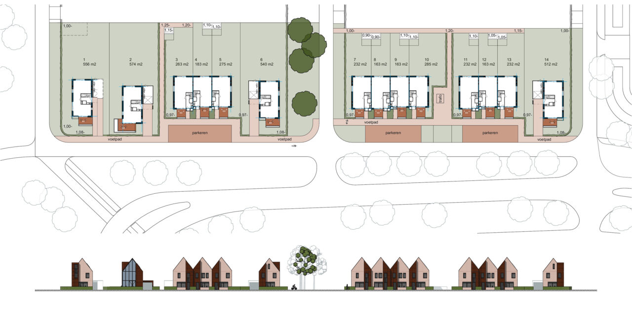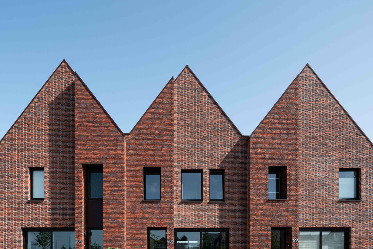 Omdat de straatzijde van de woningen op het zuiden ligt, ontstond de kans om de buitenruimte integraal met de gevel mee te ontwerpen. De gemetselde plantenbakken en het groen zorgen voor buitenruimte met veel privacy. Ook versterken ze het representatieve, dorpse karakter van het geheel en sluiten ze ruimtelijk en visueel aan op de plastiek van de gevel.