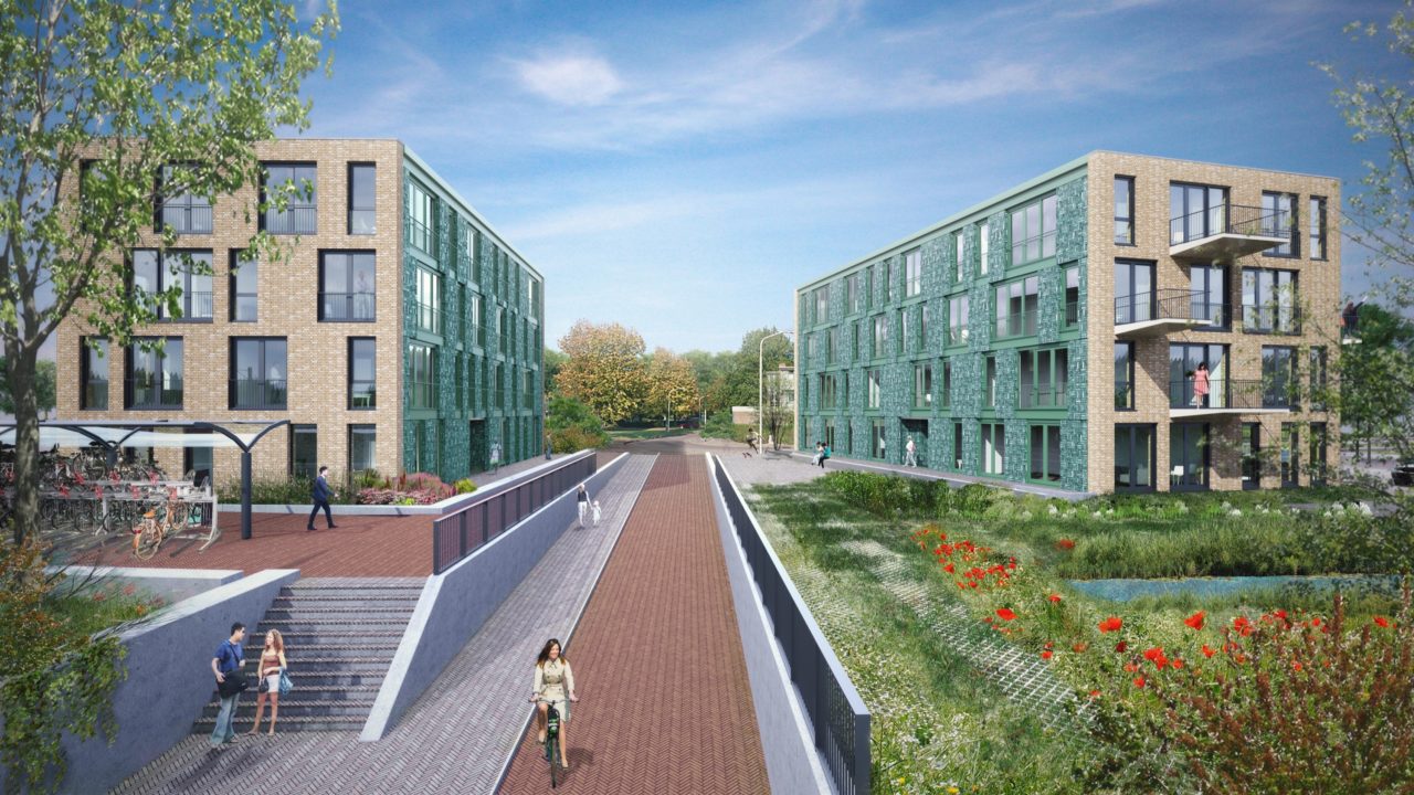 De beide blokken zijn opgetrokken uit een gevarieerde zandkleurige baksteen die aansluit op de sfeer en uitstraling van de buurt. Naar het fietspad toe hebben ze een speelse groene keramische gevel, die samen met het gevarieerde nieuwe groen een aantrekkelijke, uitnodigende sfeer creëert.